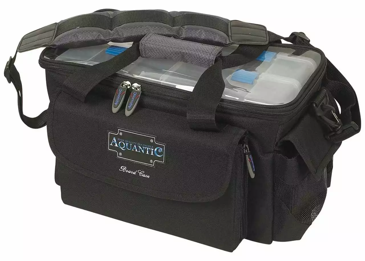 Inklusive zwei tiefer Boxen und aufklappbarer Fronttasche mit Einhängemöglichkeiten für Pilker. Der Deckel der Tasche ist aus Klarsichtsmaterial, so lässt sich ein schneller Überblick verschaffen, ob alles an Bord ist. An einer Seite befindet sich noch eine Außentasche mit Mesh-Material und an der anderen ein Zangenhalter. Der extrem stark gepolsterte Schultergurt sorgt für ein angenehmes Tragen auch bei beladener Tasche.