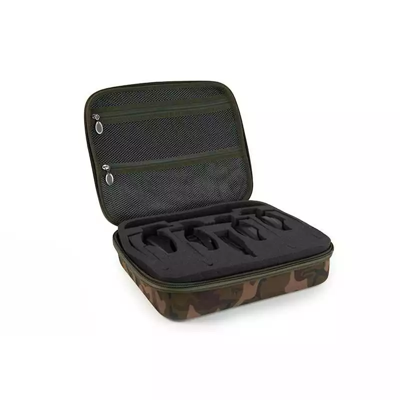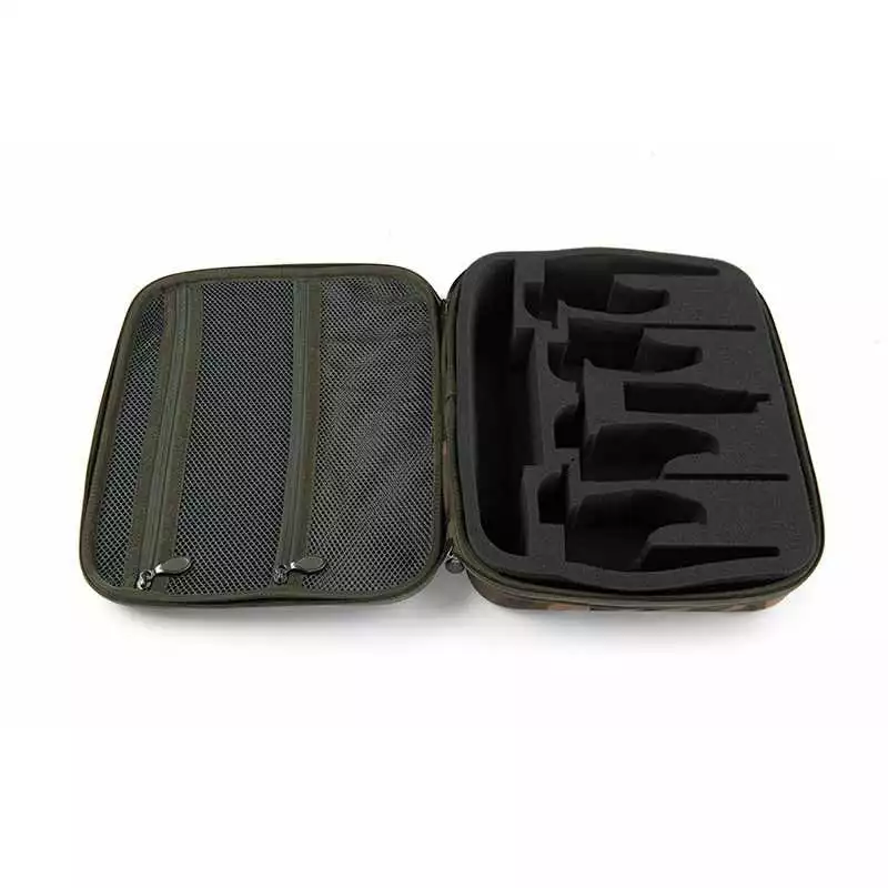 Die Schutztasche für die RX+ besteht aus gegossenem EVA in Camo-Optik. Sie ist so konstruiert, dass bis zu vier RX+-Bissanzeiger und ein Receiver darin Platz finden. Weiteres Zubehör passt ebenfalls in die Tasche.