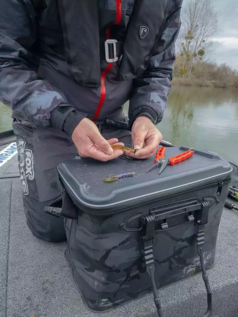 Viel Platz für Ihr Angelmaterial. Der hartgeformte Plattformdeckel ist praktisch für kleine Arbeiten während des Angelns (Fox Rage-Schild)
