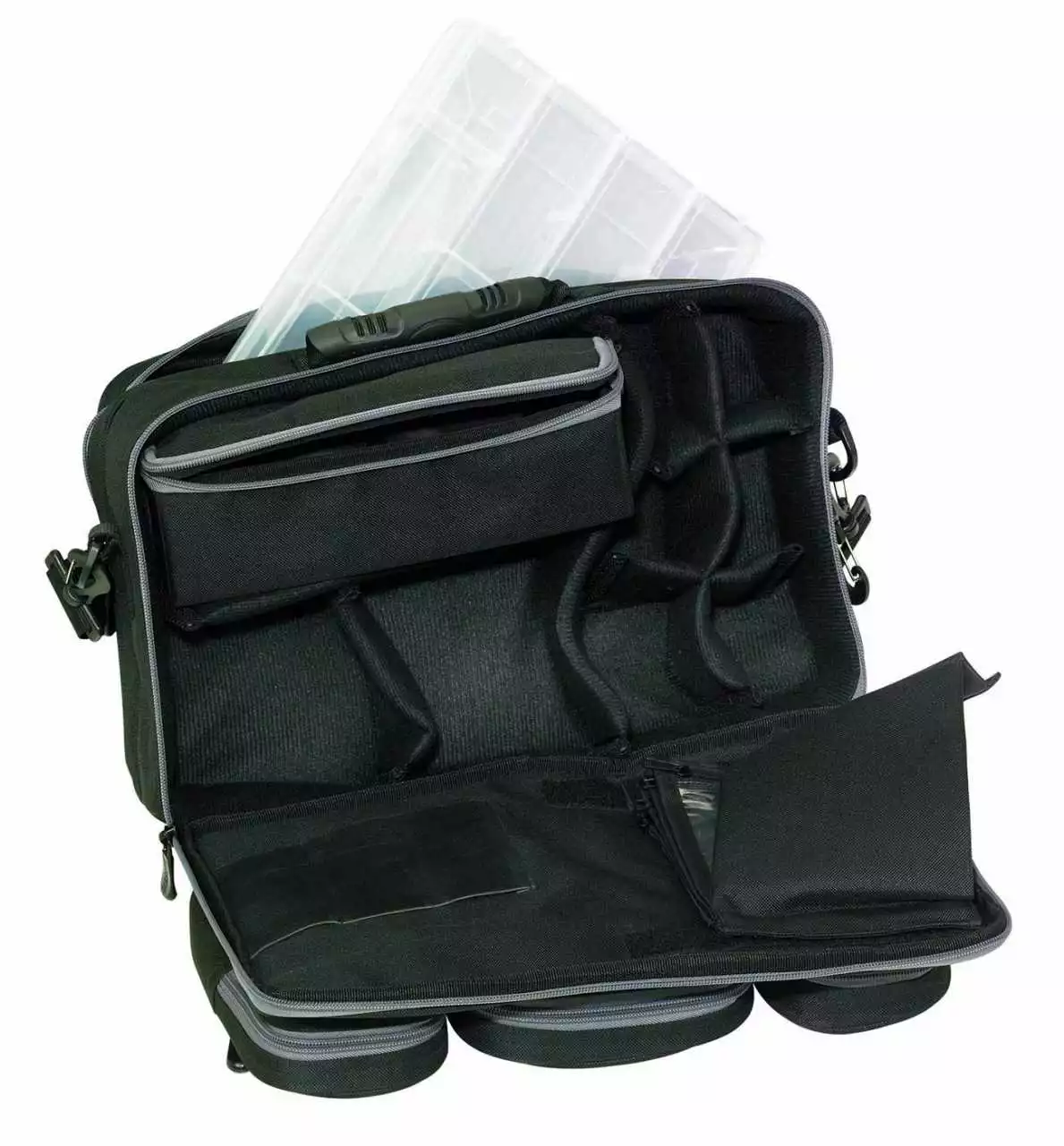 Im hinteren Bereich ist eine ca. 35 x 22 x 5 cm große Variobox zum Aufbewahren von Zubehör untergebracht. In der Frontpartie sorgen 3 weitere aufgesetzte Taschen für zusätzlichen Stauraum. Der ergonomisch geformte Griff und der gepolsterte Schultergurt garantieren einen bequemen Transport.