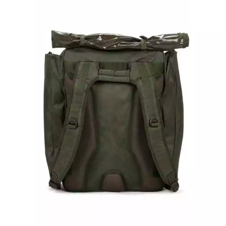 Die Endfächer haben eine wasserfeste Oberfläche, damit sie beim Ausklappen kein Wasser aufnehmen können. Das Hauptfach hat einen Reißverschlussdeckel mit praktischer Aufbewahrungsmöglichkeit auf der Innenseite mit vier kleinen und zwei großen elastischen Netztaschen. Zudem ist das Innenfutter des Ruckall durchgehend mit dem Nash Micro-Fischmuster-Camo bedruckt.