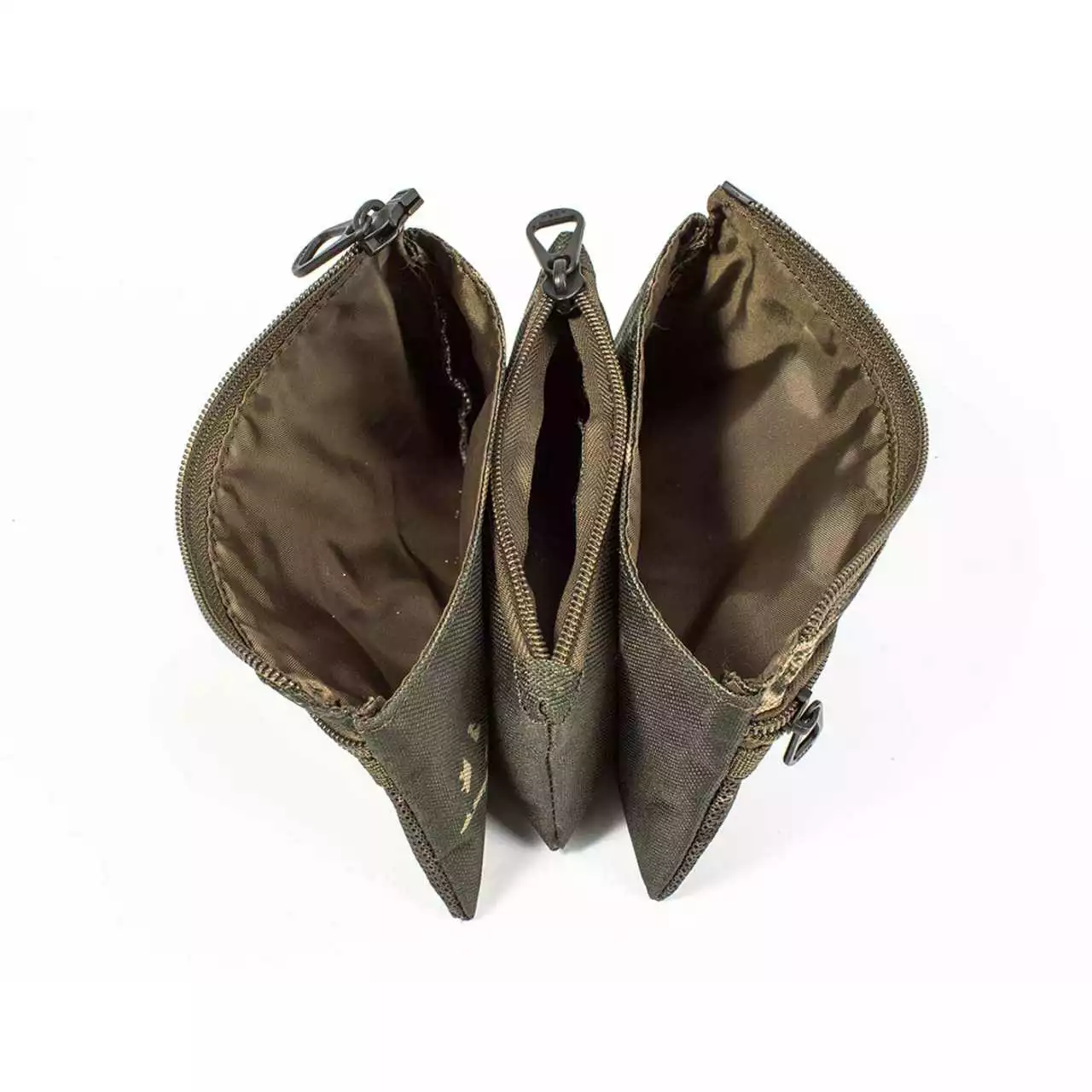 Der Scope Ops Ammo Pouch besteht vereinfacht gesagt aus drei einzelnen Taschen, welche miteinander verbunden sind. Davon ist jede einzelne mit einem Zipp unabhängig von den anderen verschließbar. Somit wird genügend Stauraum geboten, um deine Angelutensilien sicher aufzuheben. Außerdem gibt es an den Außenseiten auch noch zwei Netztaschen.