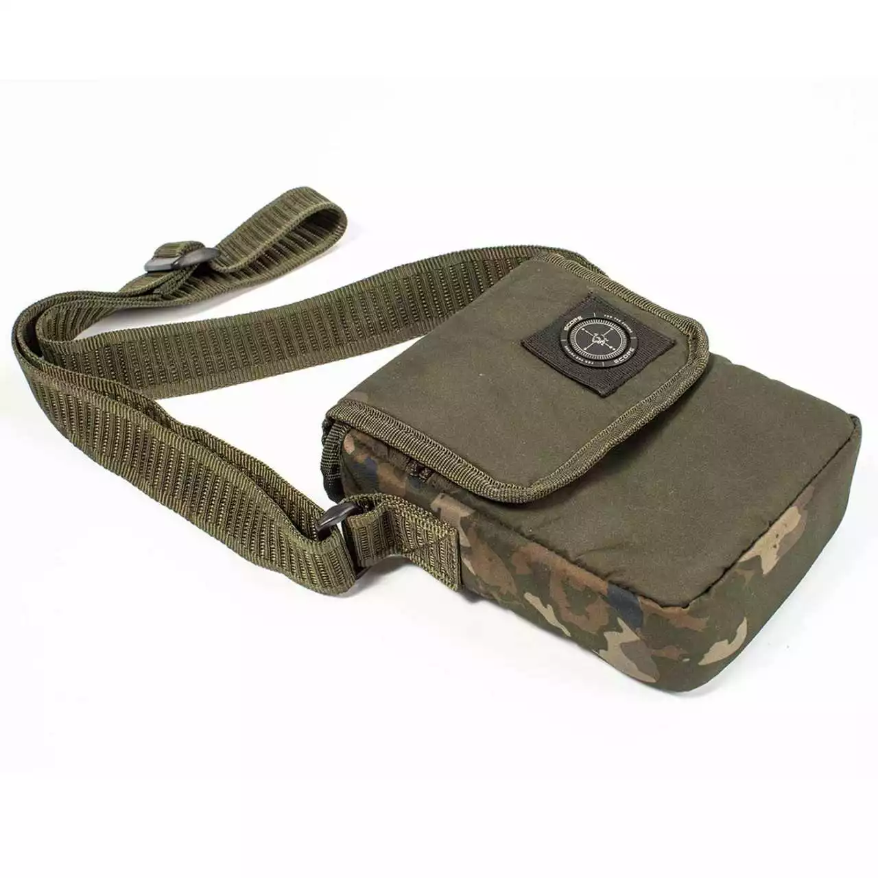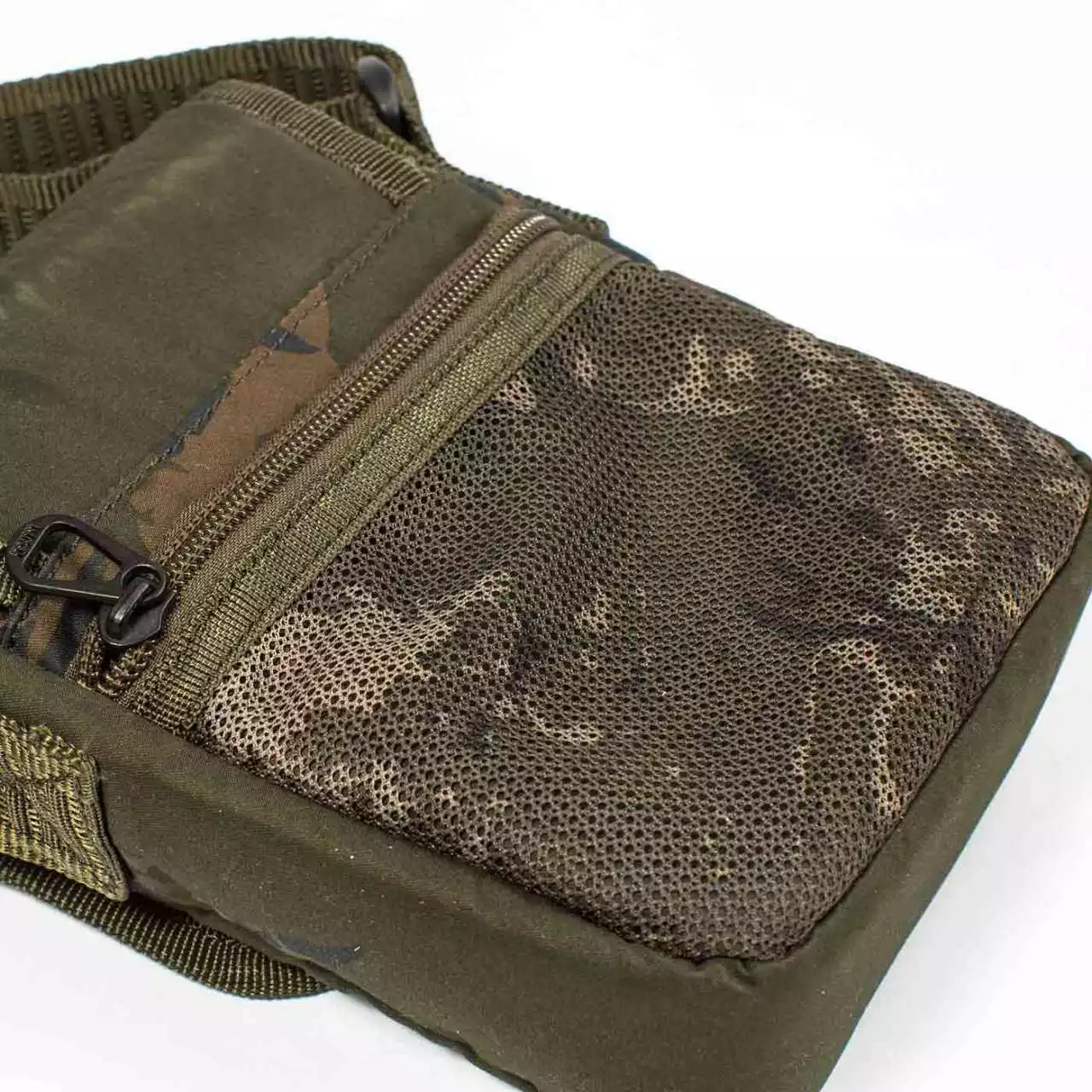 Auf den ersten Blick entdeckst du, dass bei dieser Tasche die Farbe Grün dominiert. Der Blickfang ist jedoch das, auf der versteiften Lasche im linken Eck angebrachte, Nash-Logo, welches durch die einheitliche Farbe im Hintergrund wesentlich mehr zur Geltung kommt. Nicht zu übersehen ist ebenso das, an den seitlichen Bereichen, der Rückseite, sowie der Basis der Tasche befindliche, Camo-Design.