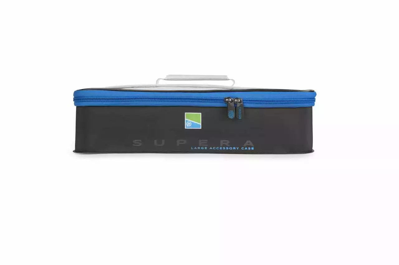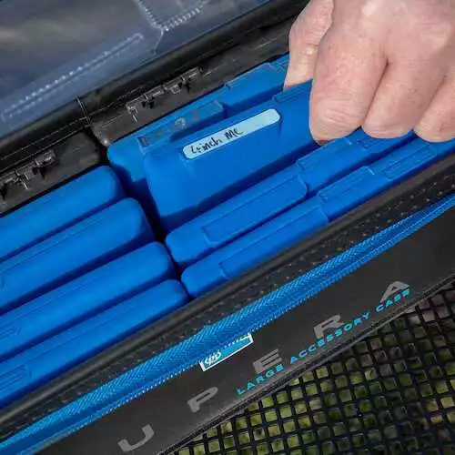 Diese Aufbewahrungsbox ist deutlich größer als eine Köderbox, aber kompakt genug, um sie leicht auf einem Seitentablett unterzubringen. Dank des durchsichigen PVC-Deckel an der Oberseite, können Sie den Inhalt der Tasche leicht erkennen.